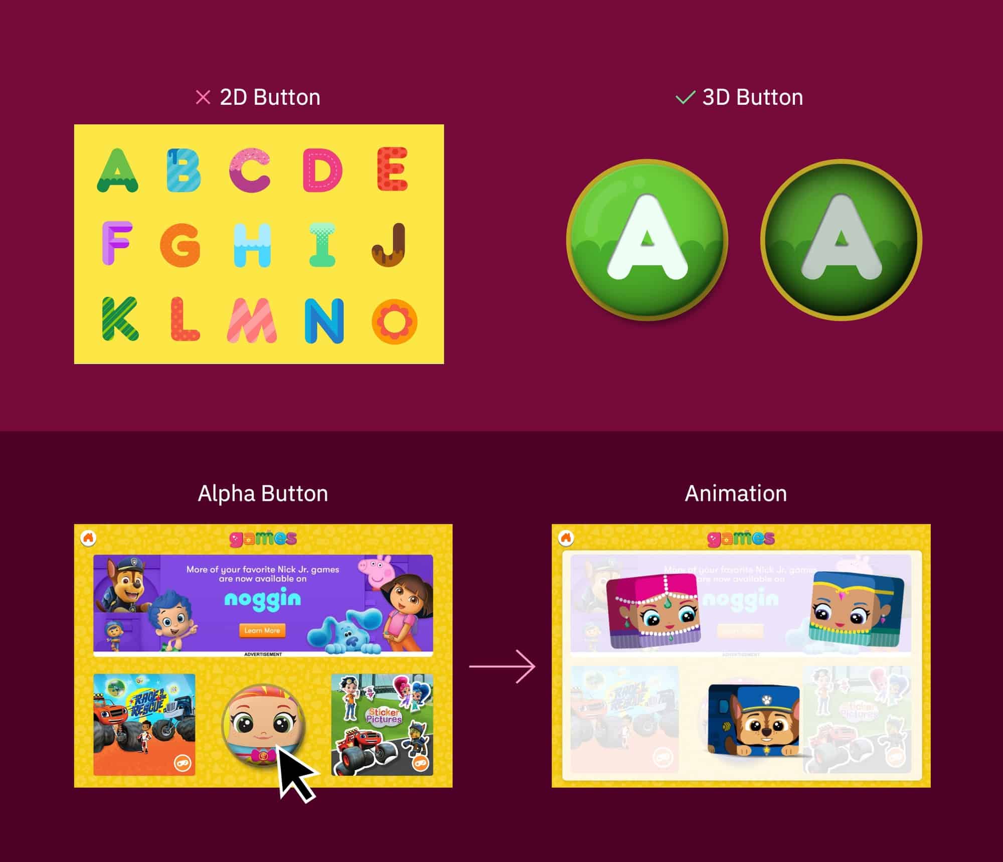 When I created the games screen, I used my expert knowledge and passion for the game to give users a fun experience through UI and interactions. I realized that kids love touching the screens from the usability testing, and they preferred 3D button designs to 2D button. And they loved the interactive button with a normal stage and pushed stage. I approached this idea to create the “Alpha button,” which is touchable and gave a surprise moment with animation and sound. It also helped discoverability of the new TV shows while the users played and explored the games screen.